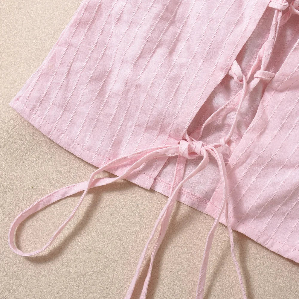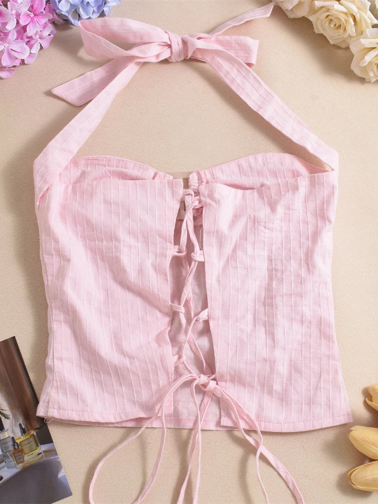 Chic Solid Color Stripe Crop Backless Halter Lace-Up Top