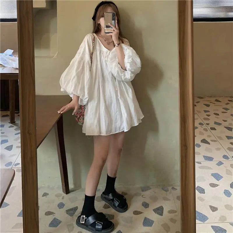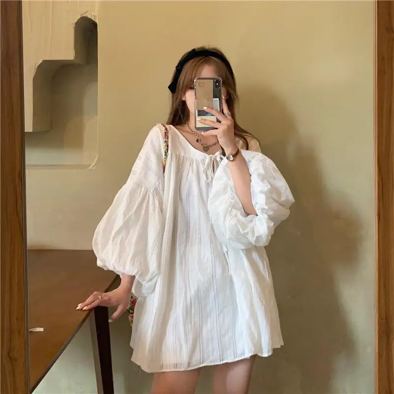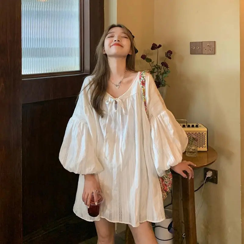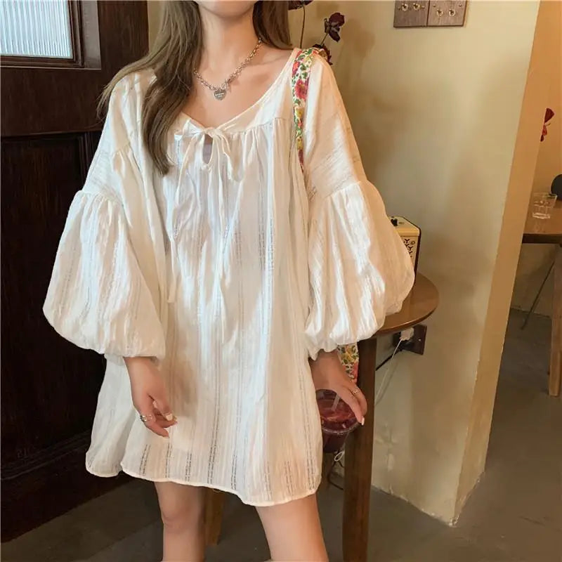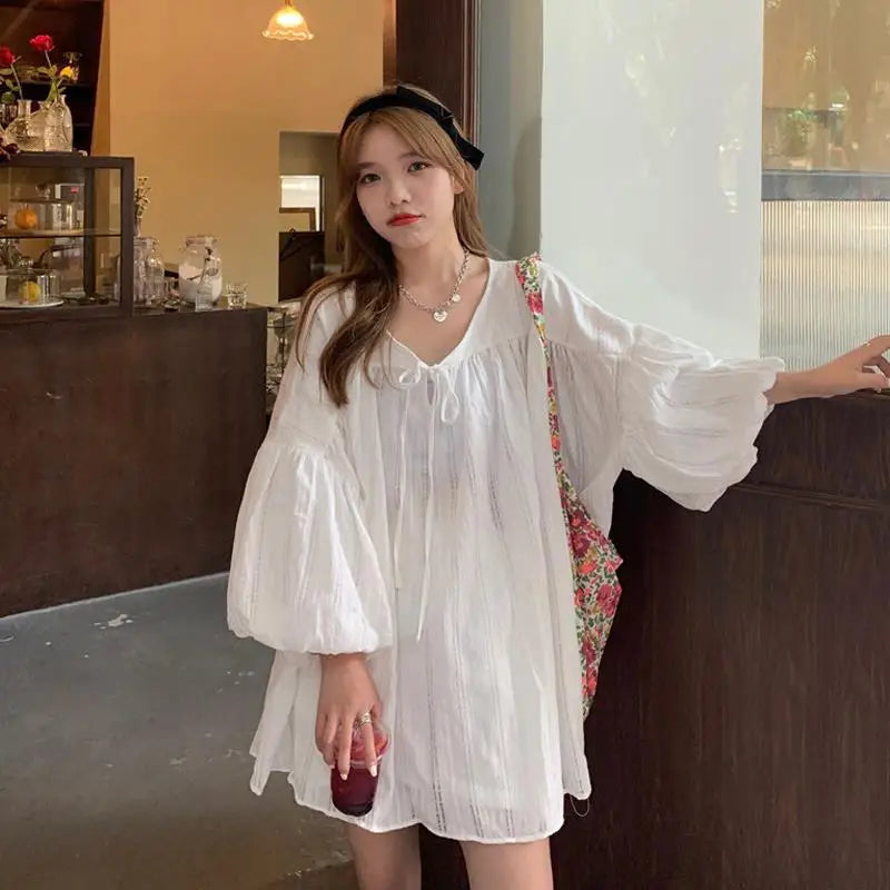 This single-piece set features a V-neck and long length (26+ inches), making it perfect for daily wear. The loose and slightly stretchy design is suitable for women in middle age, with a formal and trendy white color that is popular among all ages. Made with a blend of polyester and cotton, this dress is comfortable and easy to wear in all seasons, whether it's spring or autumn. The pullover dress has full-length lantern sleeves and is decorated with bandages for a chic look. Its fabric type is broadcloth with a slight elasticity, and it is designed to have a regular fit. Perfect for all occasions, this dress is a must-have addition to any wardrobe.