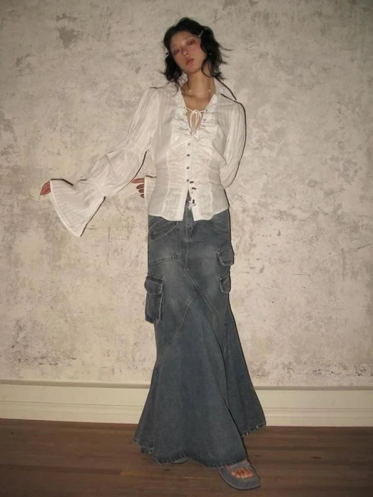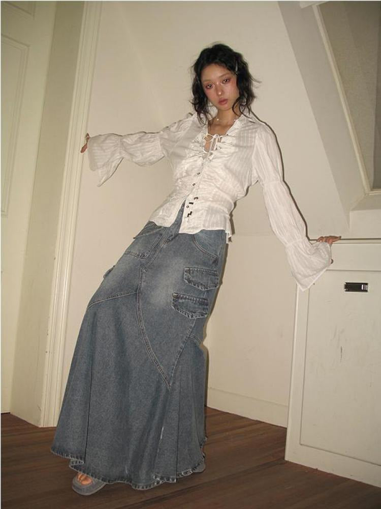 Flare Sleeve Lace Up Single Breasted Bowknot Blouse