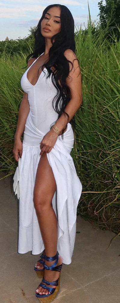 2 Piece Set Classic V-neck Camis Bodysuits + Tied Split Ruffle Maxi Skirt