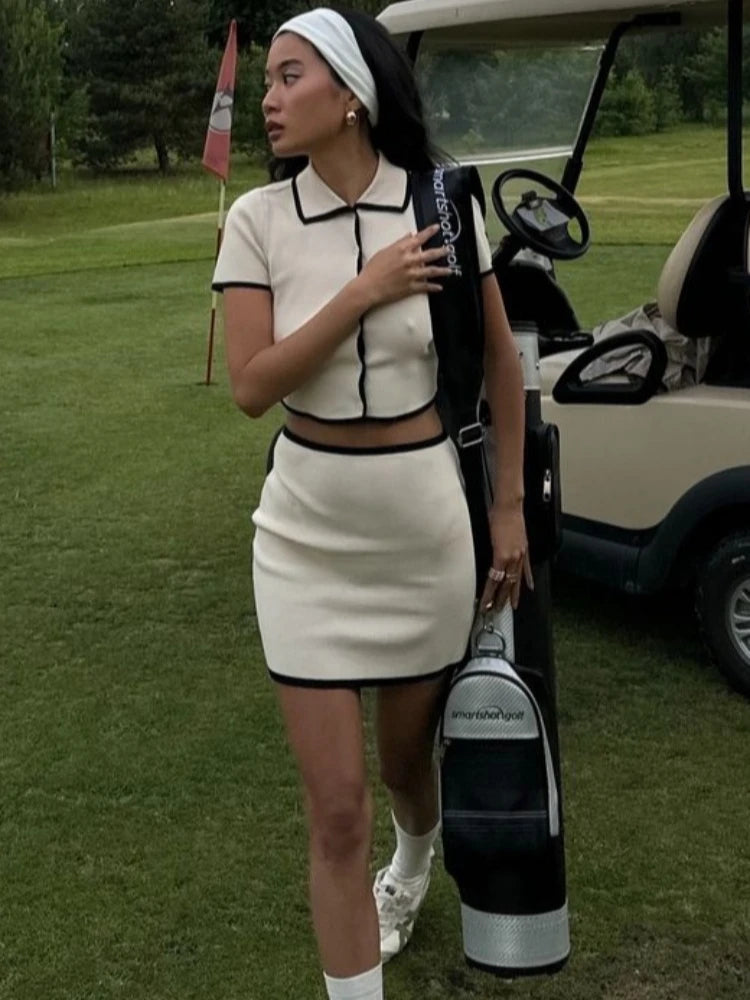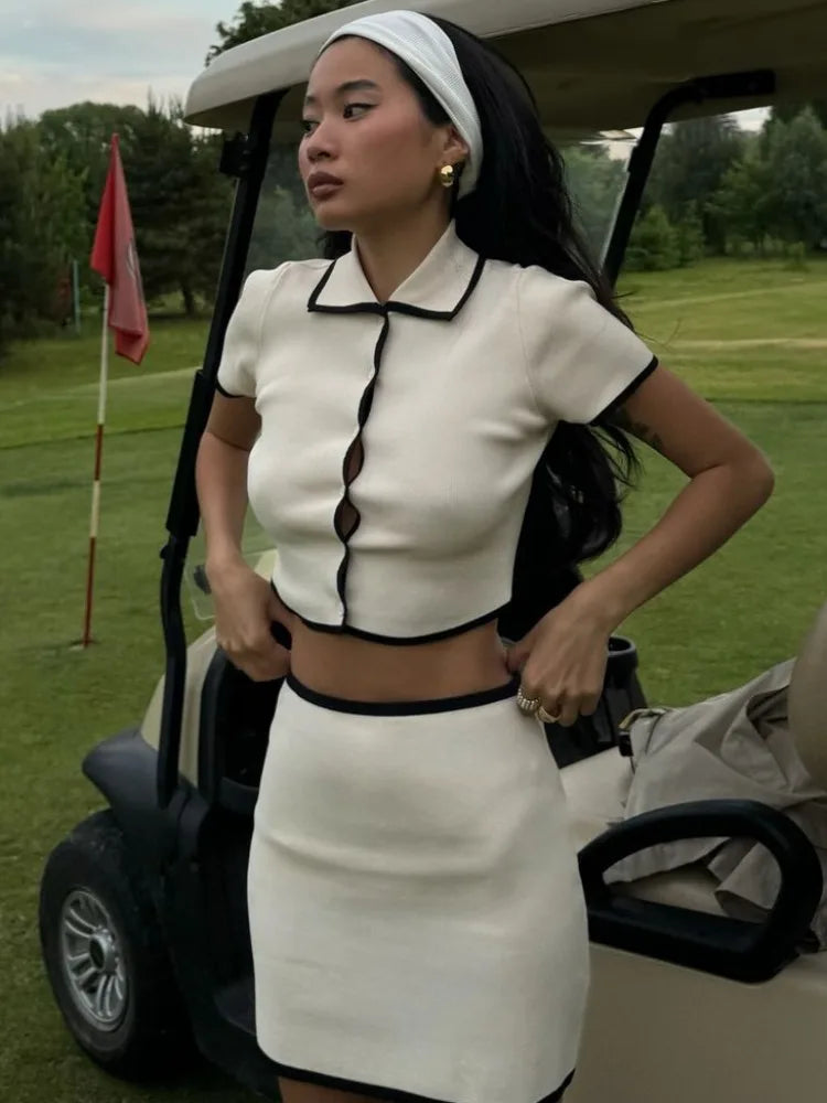Short Sleeve Lapel Cropped Cardigan + Contrast Skirts Knitwear 2 Piece Set