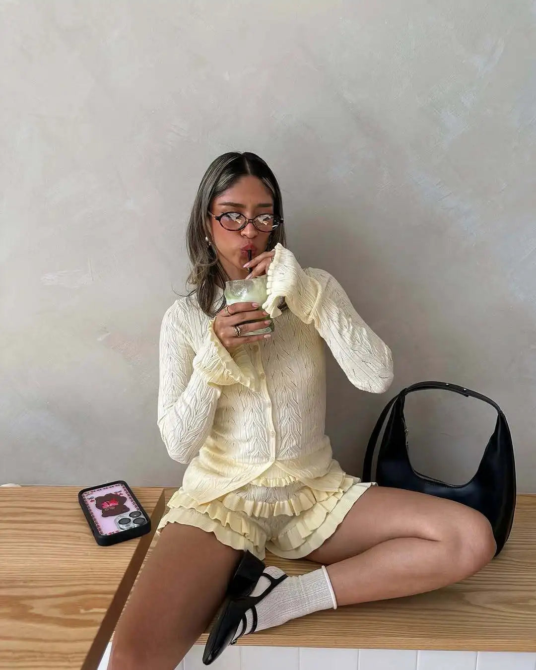 Elegant Slim Ruffle Long Sleeve Top and Mini Shorts Two piece Set