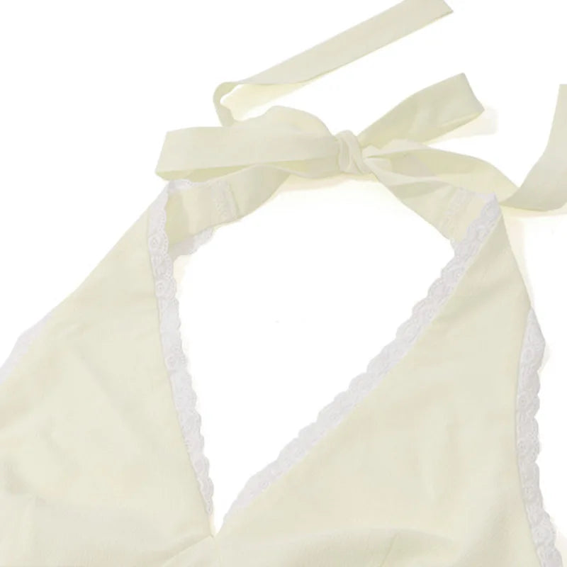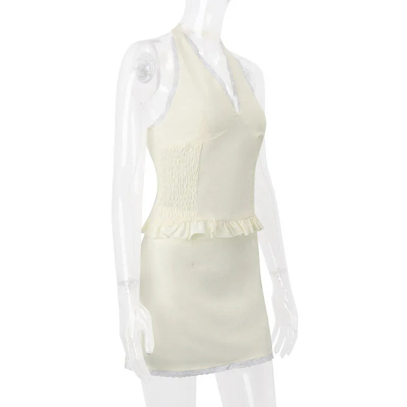 2 Piece Lace Trim Tie Halter Neck Ruffle Top + Mini Skirt